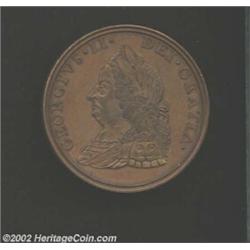 George II copper American Indian Badge 1757, Laureate bust of George II left/An Englishman and an Indian smoking a peace pipe with the date below, MI II, p. 682, 399. These medals were struck in both copper and silver and following the break with France in 1756, they were presented to certain American Indian Chiefs to help form alliances between the British and the Indians. Nice XF and unholed. Important notice: We expect to be auctioning lots at the rate of 200-250 per hour. Sometimes eBay Premier live bid software cannot keep up with that pace, so we strongly recommend that you place a realistic proxy bid now as insurance to avoid disappointment. Also please note that all Heritage/CAA lots purchased through eBay Premier carry a 20% Buyer's Premium. Please make sure you read the Terms and Conditions.