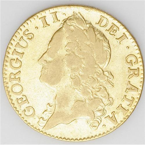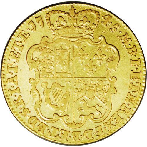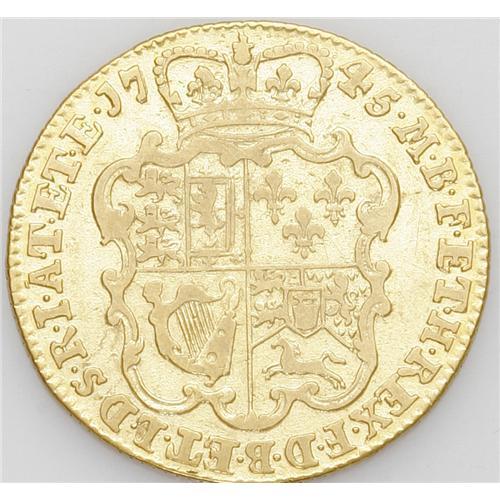 George II guinea, 1745. S-3678. F-VF, a most unusual co George II guinea, 1745.
