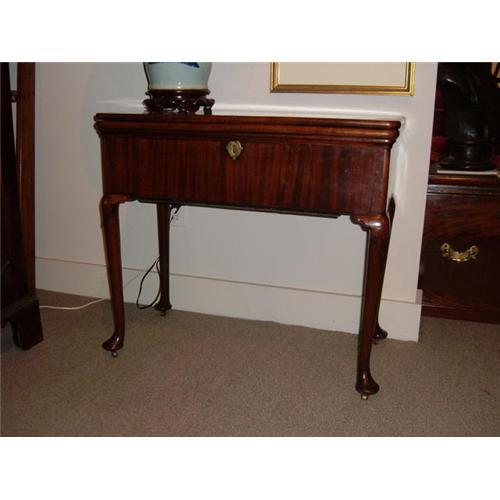 A George II harlequin table of mahogany with a double-fold top acting as a side table and card table and as a pull-up desk with spring action desk compartment. 31 1/2" when table is open.