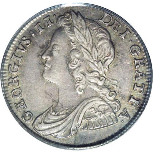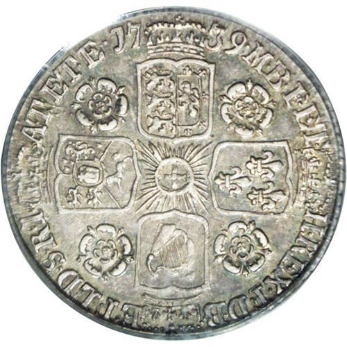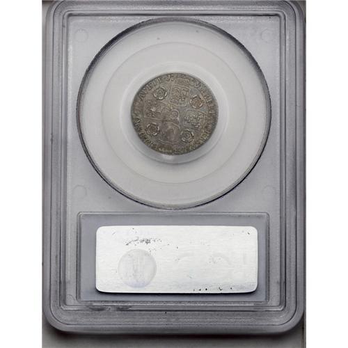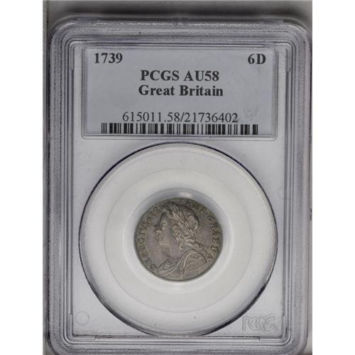 <B>George II sixpence, 1739 Roses. </B></I>S-3708. AU58 PCGS. Interesting obverse die blunders, as follows: O over R and broken-top R in the king's name, a variety listed by Spink. D over D in DEI as well. "AEF" in British grading terms, but certainly much nicer than most of these, even discounting the rarer variety. Should garner many bids.