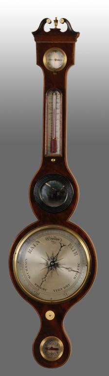 Description Circa 1800. Line inlaid mahogany case with scrolled-arch pediment and brass mounts. Excellent condition. Condition (Excellent). Size 38" x 9 - 3/4".