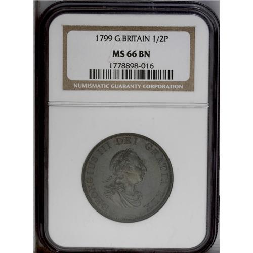 <B>George III Halfpenny 1799,</B></I> S-3778, Soho Mint, ship with five gunports, MS66 Brown NGC. Iridescent lustrous surfaces with even chocolate-brown color and slight softness on a few hair curls, otherwise the strike is bold.