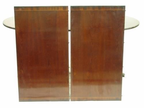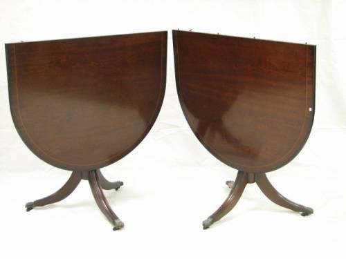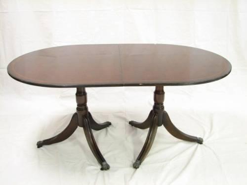A George III Style Mahogany Inlaid Tilt-top Pedestal Dining Table. Features two 32" tilt-top D-shaped ends with reeded edges, supported by an columnar pedestal with outstretching legs ending in brass hairy paw capped caster feet, the two removable supporting long cleats that stabilize leaf board underneath, with two 15" wide leaf boards. Condition: Dimensions: 64"L x 39.5"W x 30"H. Extends to 106.5" with the two boards inserted.