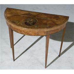 The sunburst veneered and crossbanded hinged top painted with an oval portrait of a young woman holding a bouquet of flowers opening to view a green baize-lined playing surface. Top with some repairs and losses to veneer and wear to decoration.