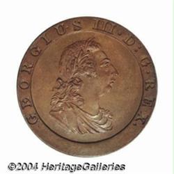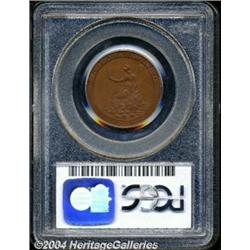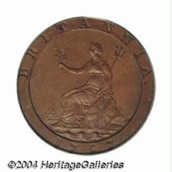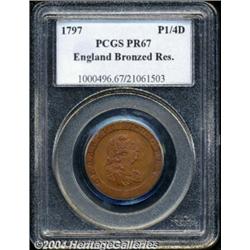 George III Pattern Farthing 1797, Peck-1194, restrike by Taylor. Bronzed PR67 PCGS. Light chocolate brown color, virtually perfect.From the Craig Haller Collection. Important notice: Heritage usually auctions material at the rate of 200-250 lots per hour. On some occasions eBay Live bid software or the Internet may not be able to keep up with the pace of the auction. We recommend placing a realistic absentee bid now as insurance to avoid disappointment. Occasionally the auctioneer may eliminate or reject an eBay Live bid, and the auctioneer may also reopen a lot after the close of the eBay live bidding (usually because we missed an audience bid), and may reject your bid even if it shows you as the winning bidder. By bidding via eBay Live, you agree that Heritage may award the lot to another bidder at its sole discretion under the circumstances described above or any other reasonable circumstances. Also please note that all Heritage lots purchased through eBay Live carry a 20% Buyer's Premium. Please make sure you read the Terms and Conditions before you bid.