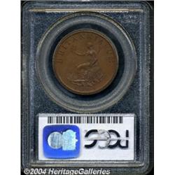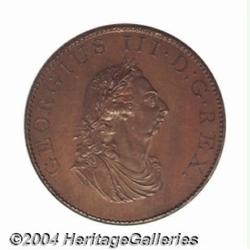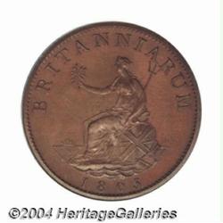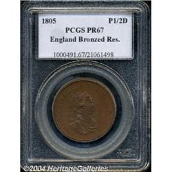 George III Pattern Halfpenny 1805, Peck-1309 (Very Scarce). Restrike. PR67 Bronzed PCGS. A little brick-red color in the bronzing. The restrikes come nice, and this one is no exception. Superb!From the Craig Haller Collection. Important notice: Heritage usually auctions material at the rate of 200-250 lots per hour. On some occasions eBay Live bid software or the Internet may not be able to keep up with the pace of the auction. We recommend placing a realistic absentee bid now as insurance to avoid disappointment. Occasionally the auctioneer may eliminate or reject an eBay Live bid, and the auctioneer may also reopen a lot after the close of the eBay live bidding (usually because we missed an audience bid), and may reject your bid even if it shows you as the winning bidder. By bidding via eBay Live, you agree that Heritage may award the lot to another bidder at its sole discretion under the circumstances described above or any other reasonable circumstances. Also please note that all Heritage lots purchased through eBay Live carry a 20% Buyer's Premium. Please make sure you read the Terms and Conditions before you bid.