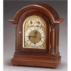 Having a three train movement striking on five gongs, the arched dial with two subsidiary dials inscribed Slow/Fast and Strike/Silent. Dial signed by retailer J.E. Caldwell & Co. Movement impressed Made in Germany and with LFS monogram. Some moldings reglued; face plate lacking screws.