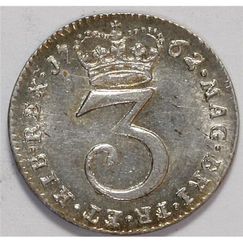 <B>George III Threepence 1762,</B></I> S-3753, lustrous UNC with a decent strike.