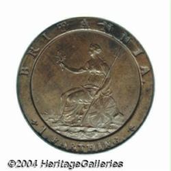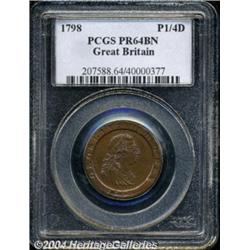 George III copper Pattern Farthing 1798, Peck-1205 (Extremely Rare). A beautiful coin from the Early Soho period. PR64 BN PCGS. Light chocolate color. Seems undergraded to the cataloguer, for there are zero problems.From the Craig Haller Collection. Important notice: Heritage usually auctions material at the rate of 200-250 lots per hour. On some occasions eBay Live bid software or the Internet may not be able to keep up with the pace of the auction. We recommend placing a realistic absentee bid now as insurance to avoid disappointment. Occasionally the auctioneer may eliminate or reject an eBay Live bid, and the auctioneer may also reopen a lot after the close of the eBay live bidding (usually because we missed an audience bid), and may reject your bid even if it shows you as the winning bidder. By bidding via eBay Live, you agree that Heritage may award the lot to another bidder at its sole discretion under the circumstances described above or any other reasonable circumstances. Also please note that all Heritage lots purchased through eBay Live carry a 20% Buyer's Premium. Please make sure you read the Terms and Conditions before you bid.