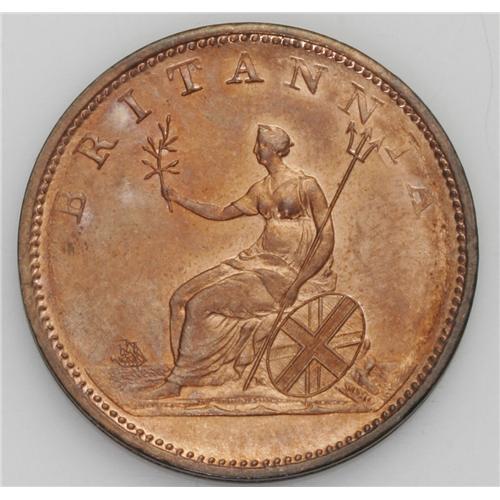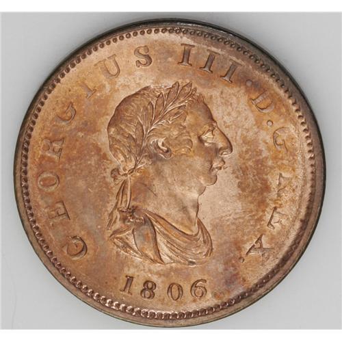 <B>George III halfpenny, 1806. </B></I>S-3781. Uncirculated with curious red surfaces.