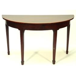 George III mahogany and line inlaid D-end dining table with centre pedestal and two leaves on tapering legs with spade feet, 9ft x 4ft extended