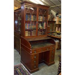 George III mahogany tambour front double pedestal kneehole desk with bookcase top having a moulded cornice, three shelves enclosed by a pair of glazed panel doors with moulded arch shaped tracery, pigeon holes and drawers below and a gilt tooled leather surface above three drawers to the frieze, centre cupboard and three drawers to each pedestal having oval brass wreath design handles with embossed brass back plates, 113cms wide x 225cms high