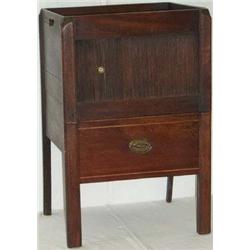 George III mahogany tambour fronted tray-top commode with pierced carrying handles, on moulded square section supports, 19.3ins. wide (see illustration). Est.£300/400