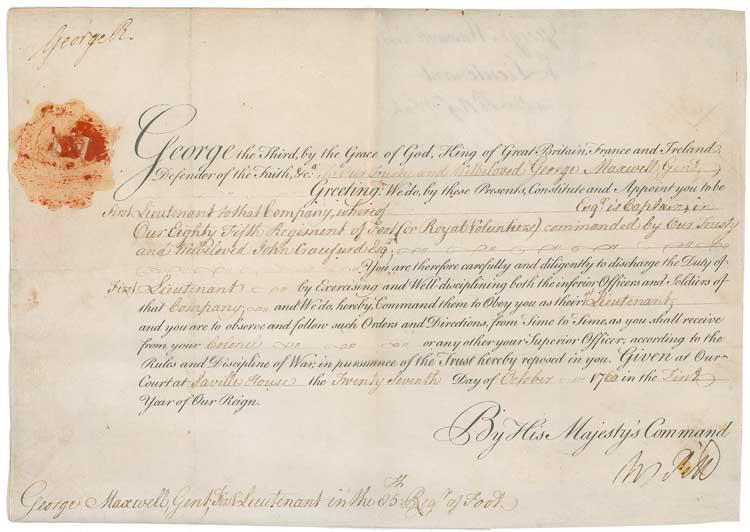 Partly-printed DS, signed “George R,” one page, 13.5 x 9.75, October 27, 1760. King George appoints George Maxwell “First Lieutenant…in our Eighty Fifth Regiment of Foot for Royal Volunteers.” Signed in the upper left “George R.” In very good condition, with intersecting storage folds, scattered light soiling and toning, and red seal remnants under signature. Pre-certified PSA/DNA and RRAuction COA.