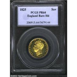 George IV Gold Sovereign 1825, Head left with date below/Crowned arms, F-377, SC-G4SV.040, KM-696, PR64 PCGS. Mark Rasmussen in his book on British proof and pattern gold lists this piece as R5 in proof (6-10 pieces known). Important notice: We expect to be auctioning lots at the rate of 200-250 per hour. Sometimes eBay Premier live bid software cannot keep up with that pace, so we strongly recommend that you place a realistic proxy bid now as insurance to avoid disappointment. Also please note that all Heritage/CAA lots purchased through eBay Premier carry a 20% Buyer's Premium. Please make sure you read the Terms and Conditions.