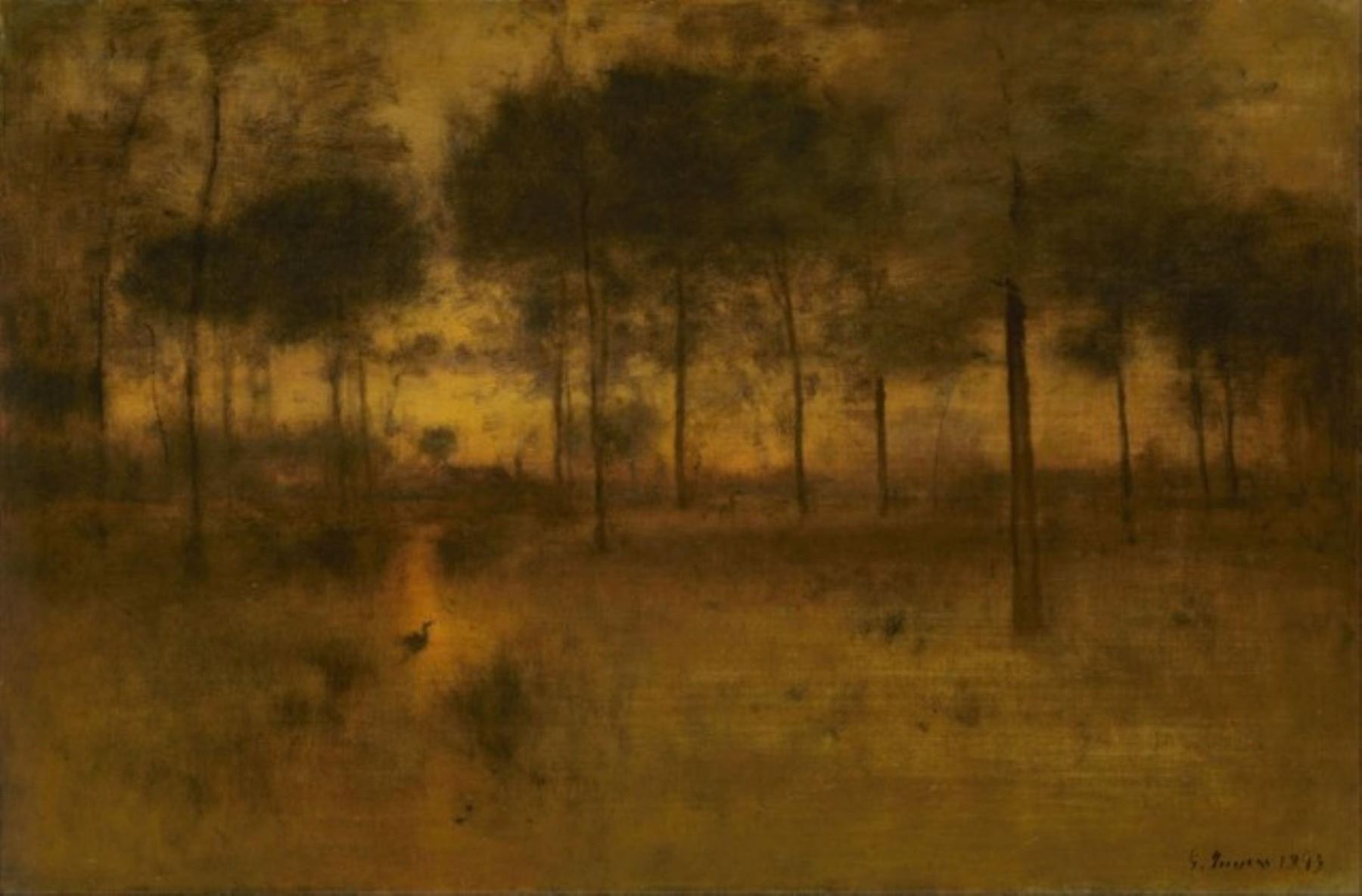 Artist: George Inness - Title: The Home of the Heron - Medium: Fine Art Giclee on Canvas - Image Size: Approximately 21 inches x 32 inches - Framed: Unframed on Unstretched Canvas - Biography: Although Inness's style evolved through distinct stages over a prolific career that spanned more than forty years and 1,000 paintings, his works consistently earned acclaim for their powerful, coordinated efforts to elicit depth of mood, atmosphere, and emotion. Neither pure realist nor impressionist, Inness was a transitional figure who intended for his works to combine both the earthly and the ethereal in order to capture the complete essence of a locale. A master of light, color, and shadow, he became noted for creating highly ordered and complex scenes that often juxtaposed hazy or blurred elements with sharp and refined details to evoke an interweaving of both the physical and the spiritual nature of experience. In Inness's words, he attempted through his art to demonstrate the "reality of the unseen" and to connect the "visible upon the invisible."