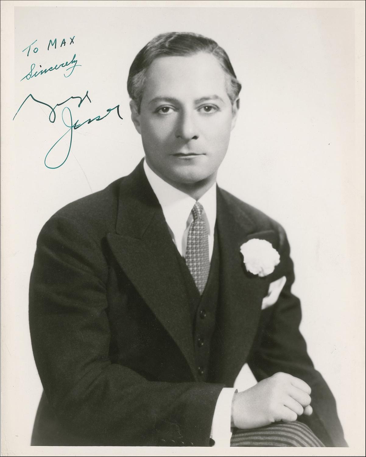 Distinguished vintage glossy 8 x 10 photo signed and inscribed in green fountain pen “To Max, Sincerely, George Jessel.” In fine condition, with strip of even, light toning along the right side and a lower left corner bump.