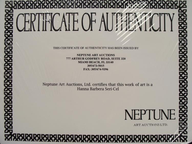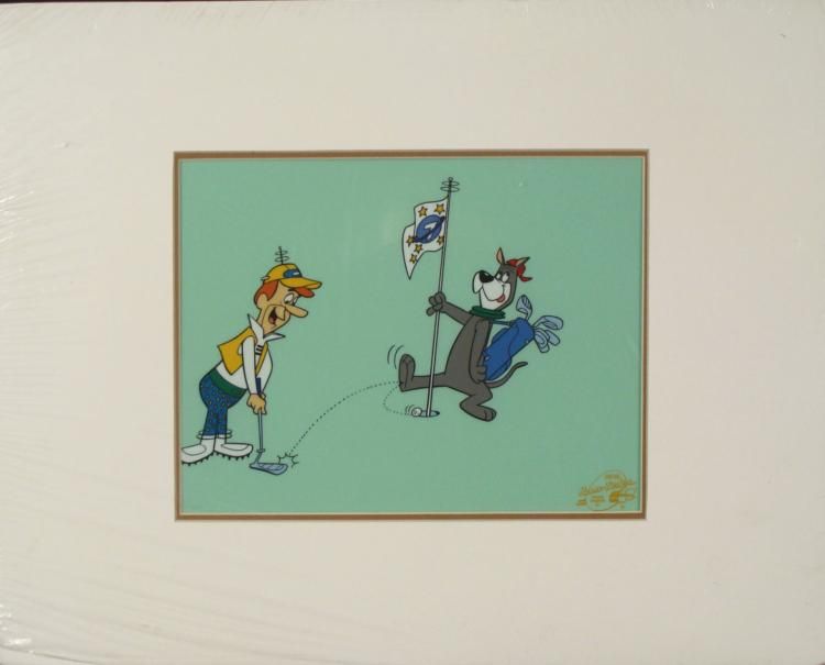 Here is a limited edition animation cel from that favorite futuristic family The Jetsons. This is a golfing scene, and with his dog Astro as an extra helpful Caddy, George Jetson is sinking one in the hole! * Medium: Serigraph celImage size: 11 x 8 1/2 inchesDetails: Hanna Barbera seal, lower right Presentation: Double matted in brown and whiteMatte size: 20 x 16 inchesCondition: Excellent; sealed in cellophaneCertificate of Authenticity: Included