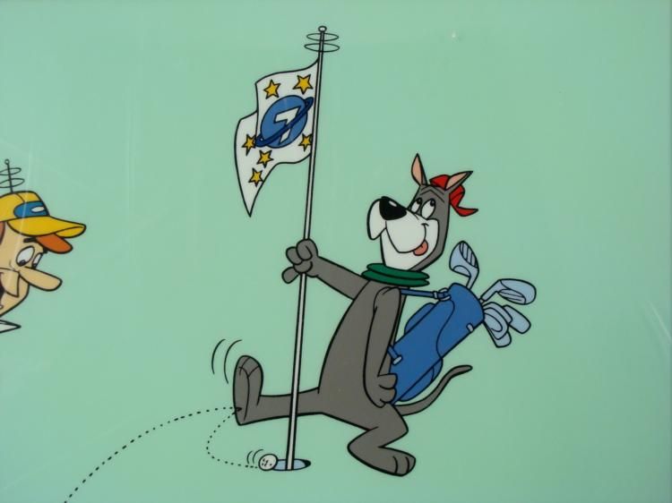 Here is a limited edition animation cel from that favorite futuristic family The Jetsons. This is a golfing scene, and with his dog Astro as an extra helpful Caddy, George Jetson is sinking one in the hole! * Medium: Serigraph celImage size: 11 x 8 1/2 inchesDetails: Hanna Barbera seal, lower right Presentation: Double matted in brown and whiteMatte size: 20 x 16 inchesCondition: Excellent; sealed in cellophaneCertificate of Authenticity: Included