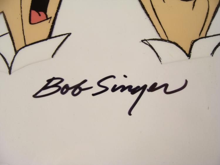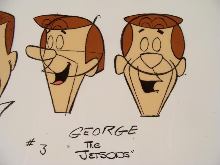 This is an original production animation model cel from the television series "The Jetsons." * Here's Geoprge Jetson- in six different close-up images on this cel, some with circles that helped the animators with facial dimensions. * Bob Singer's signature appears in black Sharpie at the bottom of the cel. * Bob Singer is an American animation artist, character designer, layout and background artist and storyboard director of animated television programs, most memorably of several Hanna Barbara productions such as The Flintstones, Jonny Quest, Scooby-Doo, Yogi Bear, Droopy, Tom and Jerry, The Jetsons, The Smurfs, Superfriends, and the Harlem Globe Trotters cartoons. * * George Jetson is married and lives with his family in the Skypad Apartments in Orbit City, where all homes and businesses are raised high above the ground on adjustable columns in the Googie style, reflective of Seattle's Space Needle and the Theme Building of the Los Angeles International Airport. George is married to Jane, the homemaker, and the couple have two children: teenage daughter Judy; and preteen son Elroy. Housekeeping is seen to by a robot maid, Rosie, handling chores not otherwise rendered trivial by the home's numerous push-button Space Age-envisioned conveniences. The family has a dog named Astro, who talks with an initial consonant mutation in which every word begins with an 'R', as if speaking with a growl.Jetson's workweek is typical of his era: three hours a day, three days a week. His boss is Cosmo Spacely, the bombastic owner of the company Spacely Space Sprockets. Spacely has a competitor, H. G. Cogswell, owner of the rival company Cogswell Cogs (sometimes known as Cogswell's Cosmic Cogs). Jetson commutes to work in an aerocar that resembles a flying saucer with a transparent bubble top. Daily life is leisurely, assisted by numerous labor-saving devices, which occasionally break down with humorous results. Despite this, everyone complains of exhausting hard labor and difficulties of living with the remaining inconveniences. * * Original Animated Cel, hand-painted, with peg holes along the bottom edge Overall Size of the Cel: 10 1/2" x 12 1/2" Title: "George, The Jetsons, #3" * Excellent Condition -ready to be matted and framedThis is an original cel used in production. Each one-of-a-kind set-up represents a slight change in position of the characters. When individually photographed and projected in rapid succession, the images appear to move. * To create production cels, the original animator's drawing is transferred onto an acetate cel (by hand-inking and/or photo copying). The cel is then hand-painted on the reverse side. * * *