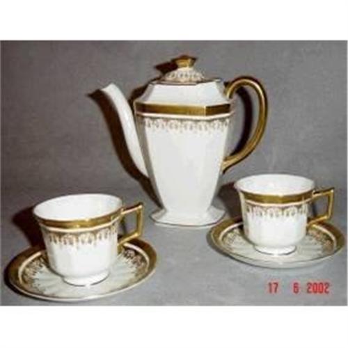 <p> coffee Pot, two cups and saucers. Decorated with a gold band detail