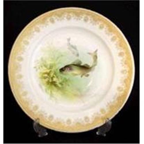 <p> Gilt decorated rim. Centre panel underwater scene with two fish