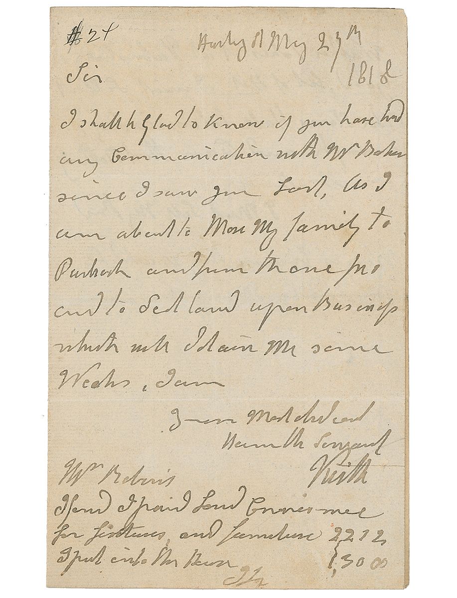 British admiral in the Napoleonic Wars (1746–1823). ALS signed “Keith,” two pages both sides, 4.5 x 7.25, May 29, 1818. Keith writes, in part: “I shall be glad to know if you have had any communication with Mr. Baker since I saw you last, as I am about to move my family to…and from there…to Scotland upon business…” Address panel on reverse penned in Keith’s hand. In very good condition, with light toning and creasing, a notation to the top left corner, a mild area of paper loss and remnants from a wax seal to the second integral page,and mounting remnants on the reverse of the second integral page.