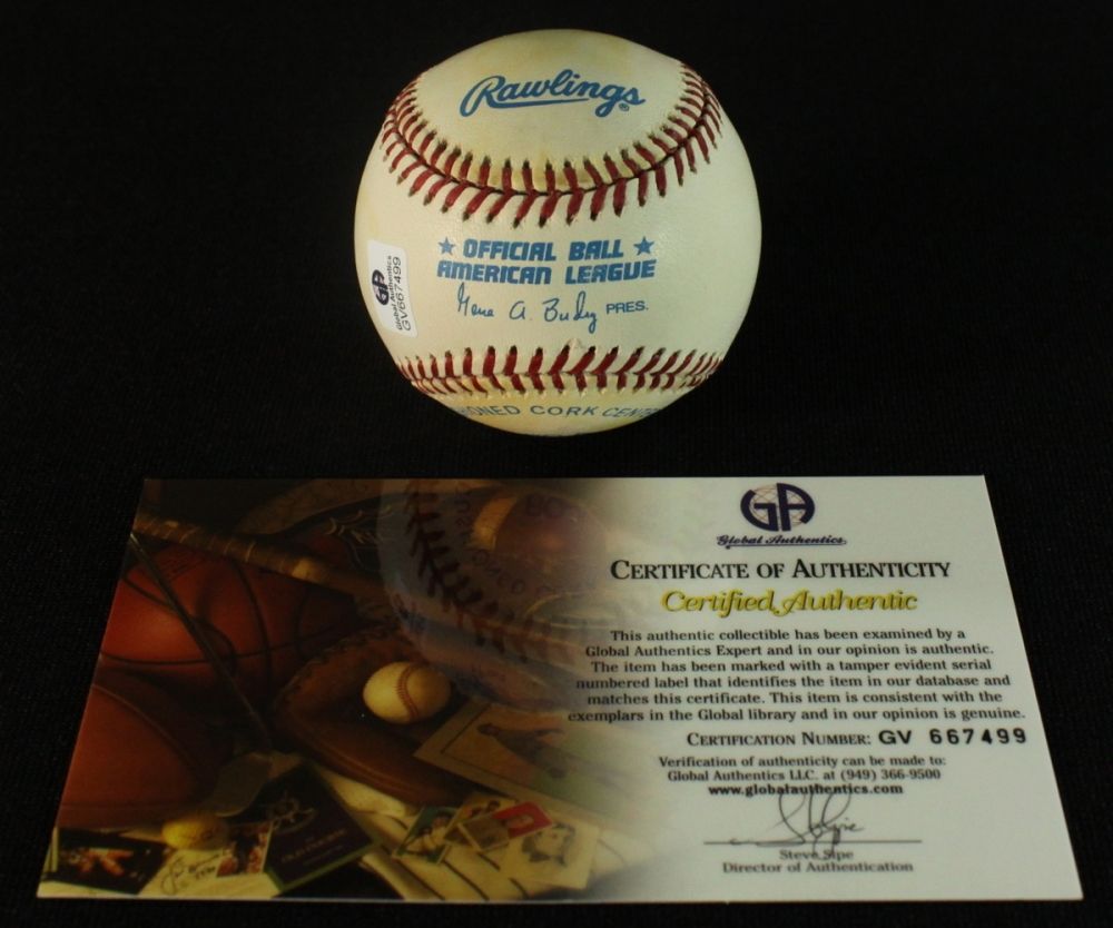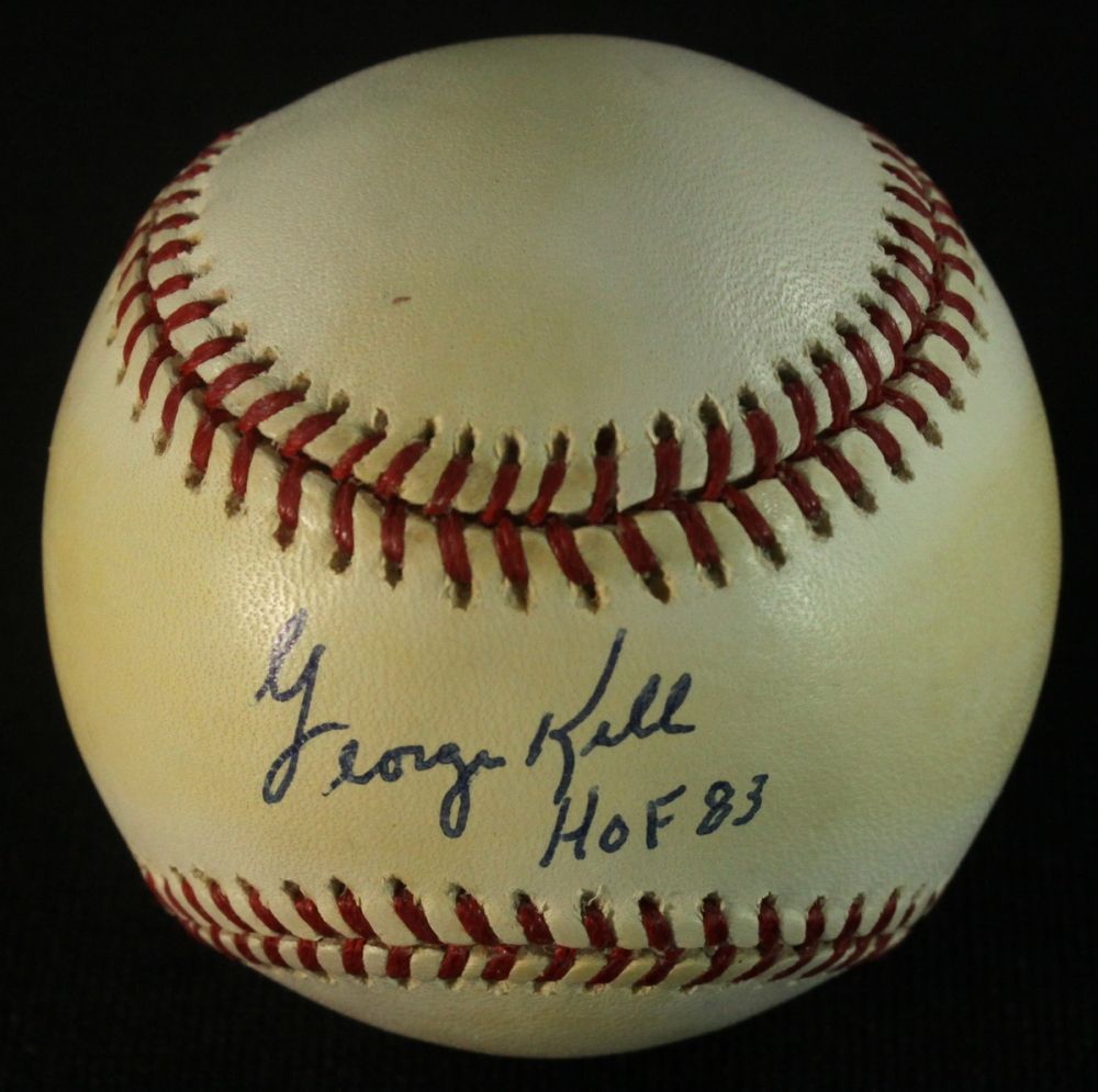 Official American League Baseball. Hand-signed and inscribed in blue ink by George Kell. Includes a Global Authentics (GA) hologram and matching COA for authenticity purposes.