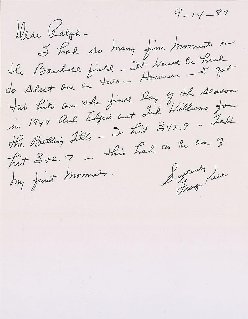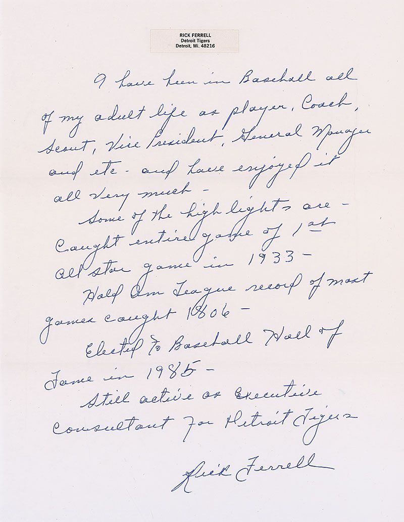 Two ALSs, each one page, 8.5 x 11, Kell’s dated September 14, 1987. Kell’s letter, in part: “I got two hits on the final day of the season in 1949 and edged out Ted Williams for the batting title—I hit 342.9—Ted hit 342.7—this had to be one of my finest moments.” Ferrell’s letter, in part: “Some of the highlights are—Caught entire game of 1st All Star game in 1933—Hold Am League record of most games caught 1806.” In overall fine condition.