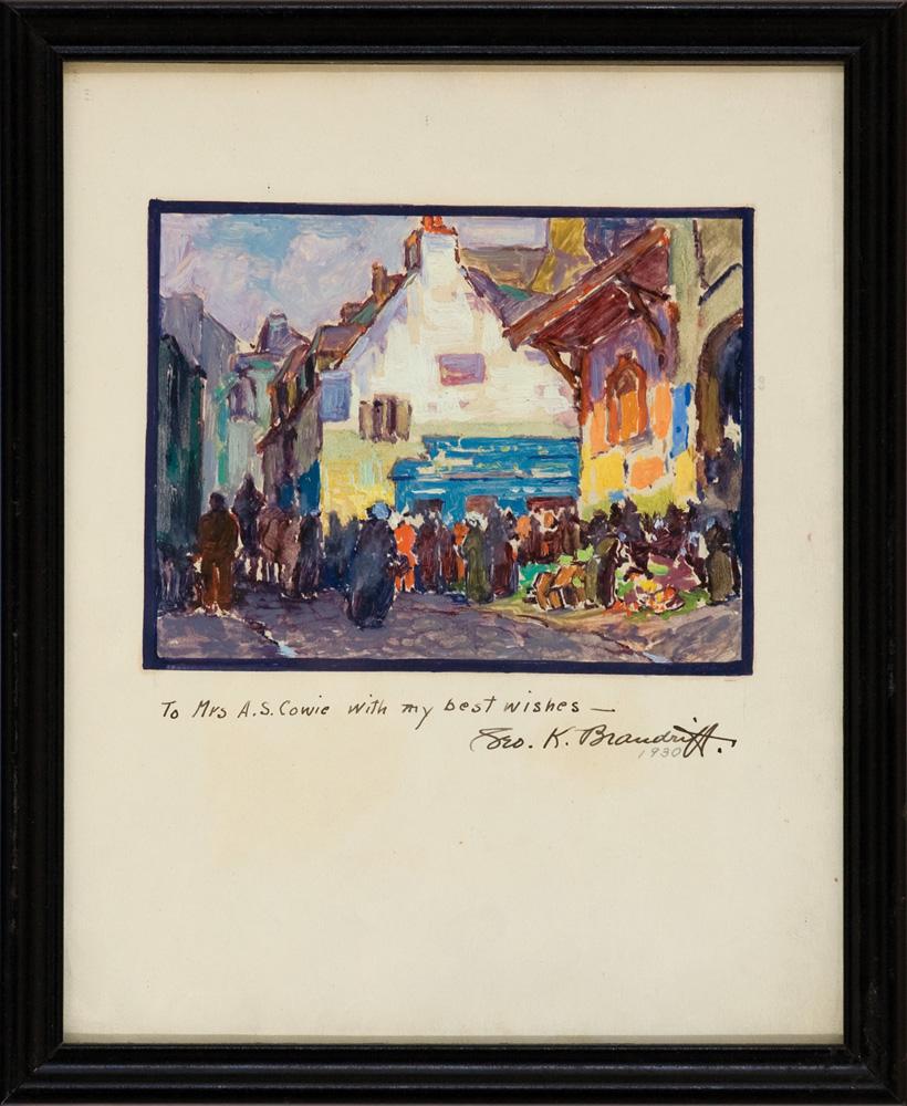 Street Scene. 4 3/4” x 6” image size; 9 3/4” x 8 1/8” paper size. Framed to 10 3/4” x 8 3/4”. Mixed media on paper. Inscribed below image: To Mrs. A.S. Cowie with my best wishes – Geo K. Brandriff in ink; dated below signature 1930 in pencil. Verso: in ink Original painting from Alex Cowie Collection/to my son Daro/Richard Flood. PROVENANCE: Ex-Flood Collection