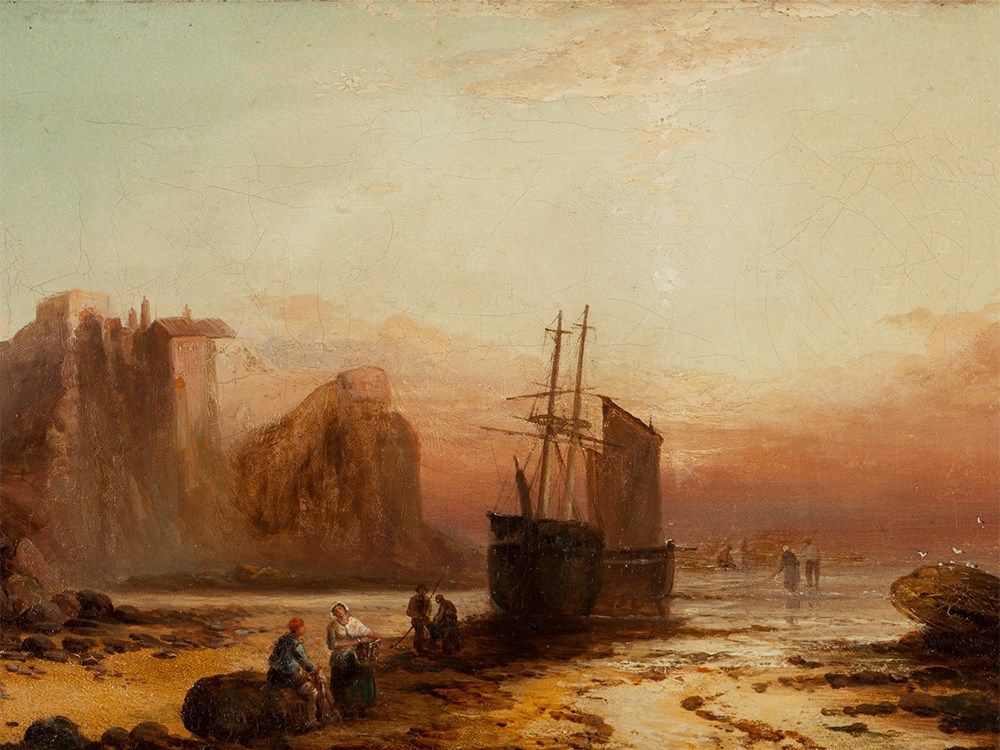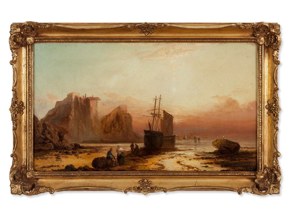 This oil painting was presumably painted by the British landscapist George Knight around 1860. In harmonious colors we look at some a boat and some figures on a shore. The scene is obviously located in Northumberland. In the background a castle situated on a hill can be discerned. The clear sky is crossed by small, occasional clouds. The setting sun creates a warm atmosphere.