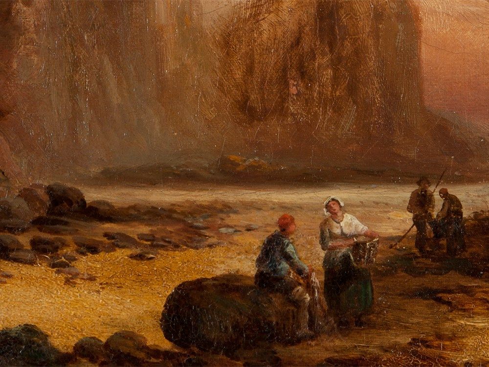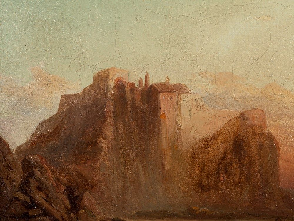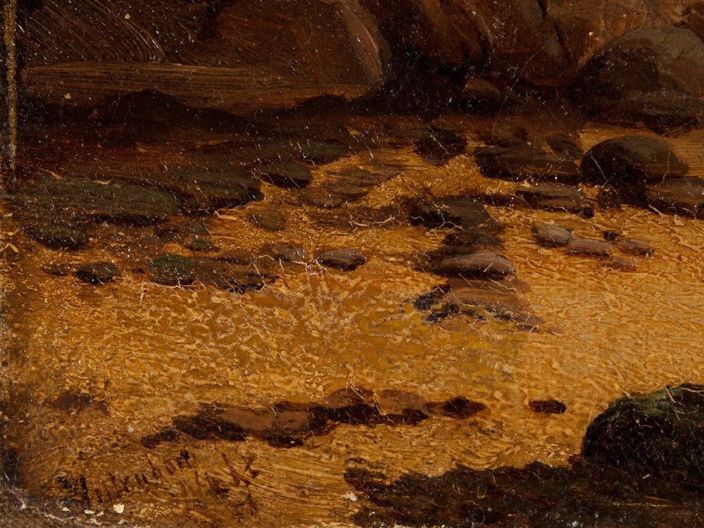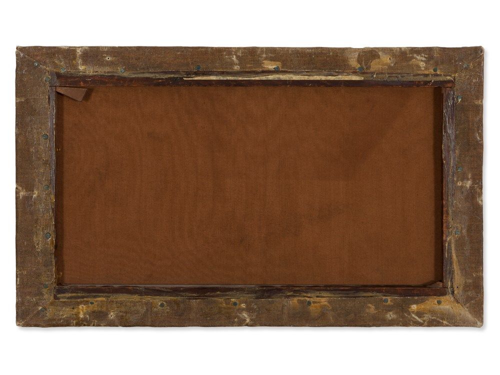 Lower left is an old, barely legible inscription. The varnished work is in good condition considering its age with some signs of wear. There are framing marks, light craquelure and some touch-ups to the background. The canvas is relined. The frame shows signs of age and wear as well. Framed the work measures 38.5 x 58.5 cm and the stretcher frame is 30.5 x 50.5 cm.