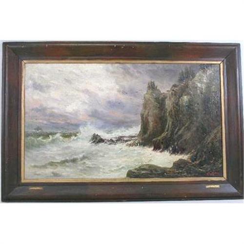 George L. Berg, American (1868-1941), "Flattery Storm Cliff," o/c, signed l.r. "G.L.Berg." Original wooden frame. Depicts a storm-battered cliff (Cape Flattery in Washington state, the most northwestern point in the lower U.S.), with large ship on horizon.
