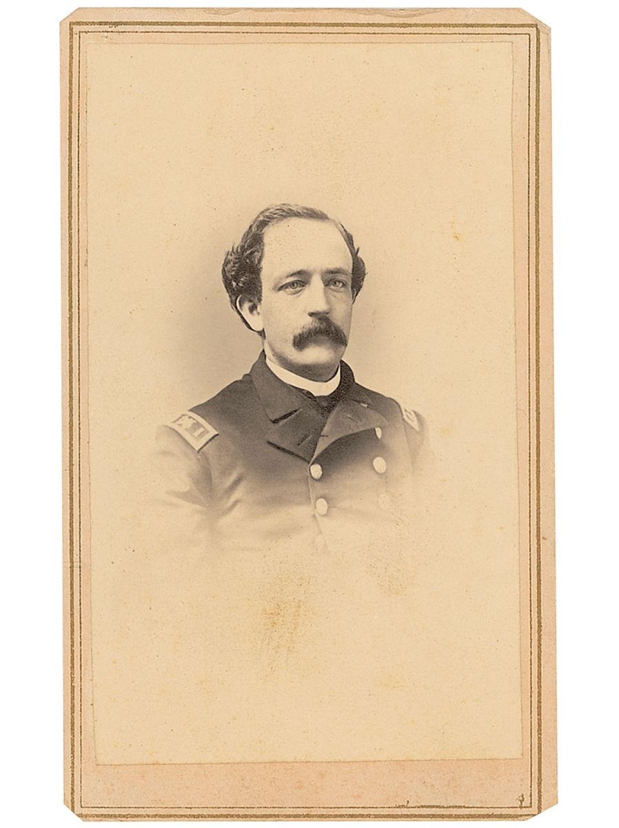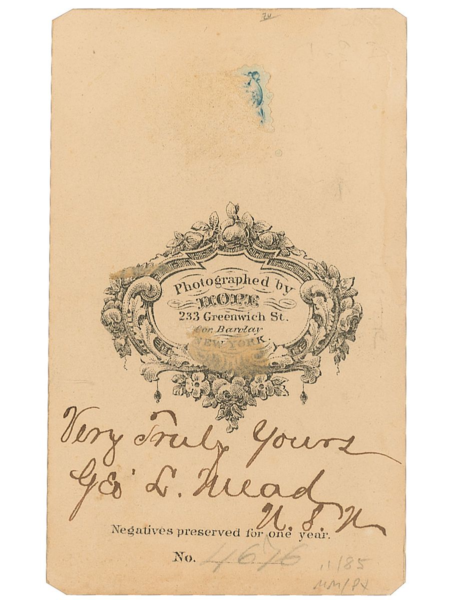 Union naval officer who served on board the Soverign and Itasca as acting assistant paymaster. Original 2.25 x 4 carte-de-visite photo by Hope of New York, signed on the reverse in black ink, “Very truly yours, Geo. L. Mead, U.S.N.” Scattered edge wear and mounting and stamp remnants to reverse, otherwise fine condition.