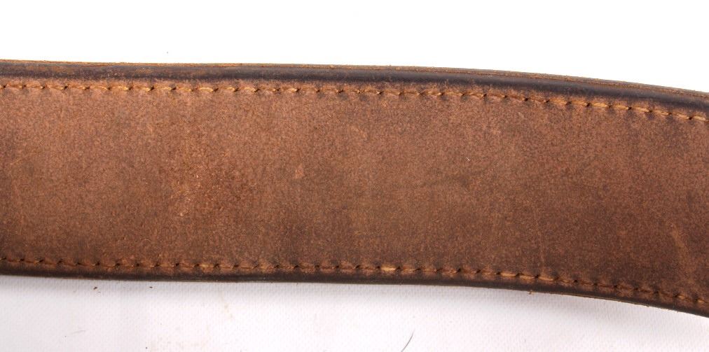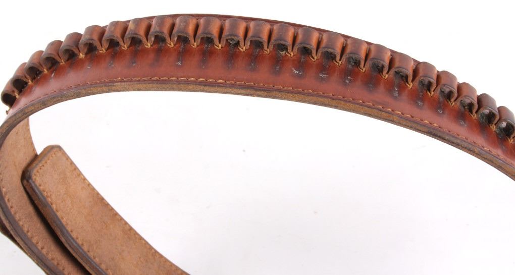 Included in this lot we have a George Lawrence ammo belt with gun holster. The George Lawrence Company of Portland, Oregon, a saddlery, harness and leather goods firm established in 1857 and incorporated in 1893. George Lawrence was one of the largest makers of leather goods in the West. The belt is made of brown leather with ammo loops along the length of the belt. The belt and holster are each marked "The George Lawrence Company - Portland. Orgeon. U.S.A. - 79 - 38 // 79 - 528". The holster features tooled leather with a buckle and leather strap. Both belt and holster are in good condition overall, showing some wear due to use. The belt measures 40" long by 2.5" wide and the holster measures 11" long by 3.5" wide.