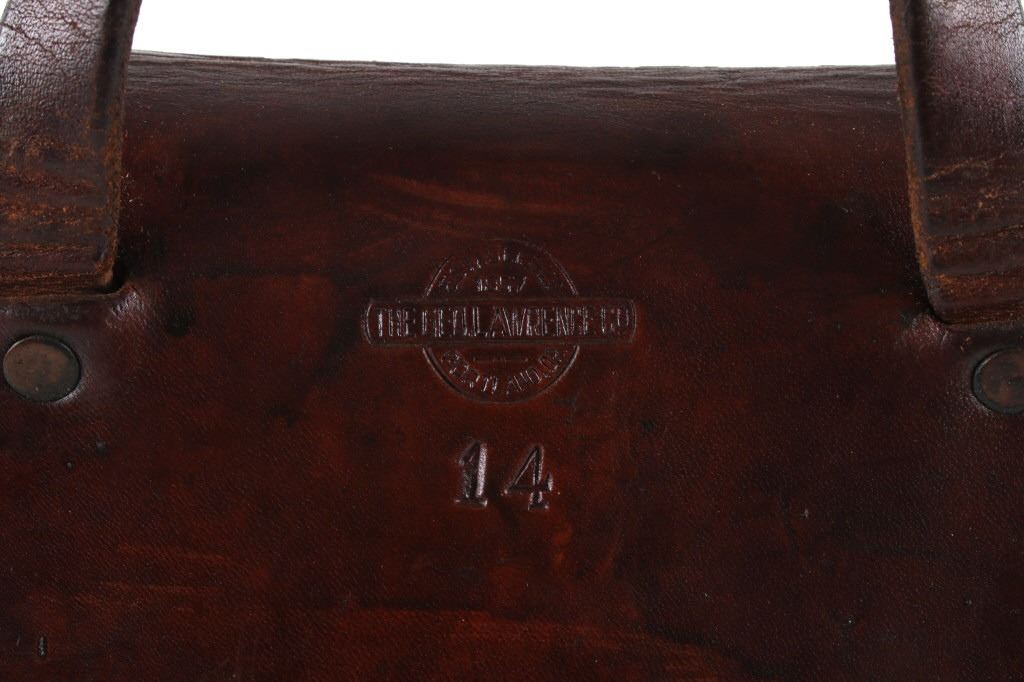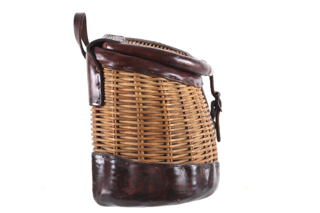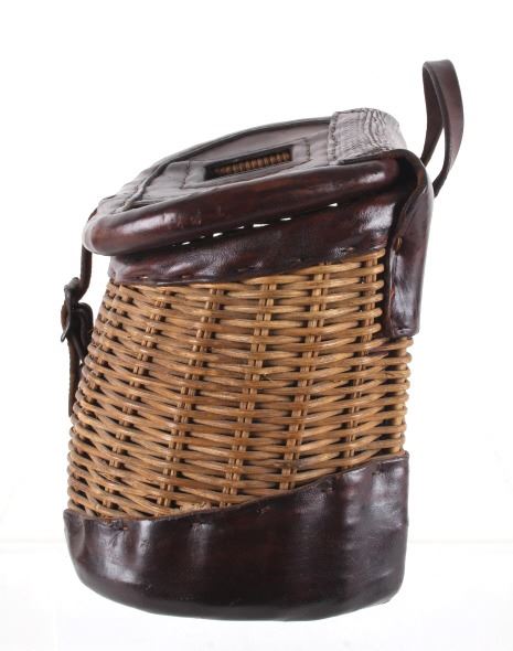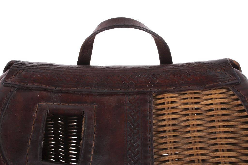 For your consideration is this George Lawrence Company Number 14 fishing creel from the 1940-50s, made in Portland, Oregon. From 1923 to 1954, the Lawrence Company was a leading manufacturer of Oregon creels in Portland. The George Lawrence Company, founded in 1857 in Portland, Oregon, was known for creating high-quality leather items, such as fishing creels. Their creels made between 1923 and 1954, are renowned for their superior craftsmanship and design. These creels have finely woven wicker baskets accented by saddle leather components. The leather is frequently tooled or embossed, revealing exquisite designs and exceptional craftsmanship. This creel features a split willow weave and leather construction and an open section in the top for throwing fish in and a handle on the back for easy carrying. The tooled leather shows geometric designs and features a metal and leather belt buckle on the front to secure the lid. The back is stamped reading, "Established 1857 / The Geo. Lawrence Co. / Portland, OR." and is stamped with the model number reading, "14". A shoulder strap is housed in the creel and can be connected through the back through two small slots. The creel shows good condition overall with little wear present and no signs of major damage noted. It measures 7" L x 14 3/8" W x 8 3/8" H and weighs 2 pounds and 8 ounces.