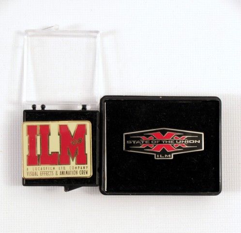 George Lucas ILM In-House Pins - ILM & XXX-State Of The Union - George Lucas' legendary "ILM" (Industrial Light And Magic) was first created by Lucas himself when he realized that his epic vision could not be created by the existing Special Effects houses, so he created his own. It has become, through the years, the watershed of innovation, and has created some of the most magnificent visuals ever produced. And of course they just continue to amazing and lift the bar for Cinema Special Effects. ILM has become a world unto itself. They have their own language, as well as customs, and special wear, including t-shirts, jackets, and specialized pins. These are two of the rare in-house pins. One is their official 2003 "ILM" pin and the other for one of their projects "XXX - State Of The Union" (2005). Both are in their original boxes. ("ILM" is approx 1.5"x1.5", and "XXX" is approx 2"x1").