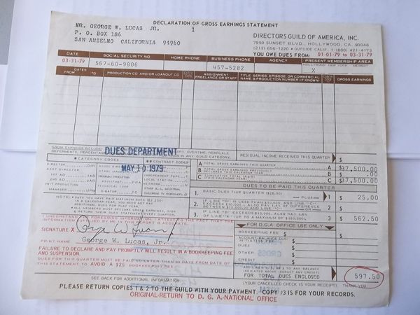 Investment grade one of a kind document from 1979, this is George Lucas' Declaration of Earnings for the Directors Guild. He stated he made only $37,500 and paid dues on that amount of nearly $600. The declaration is signed with a full George W. Lucas, Jr. signature.