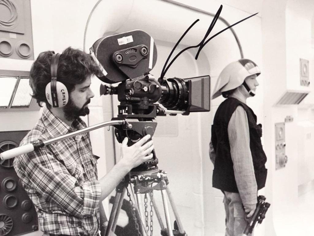 George Lucas signed photo. This is a great behind the scenes shot from the movie Star Wars. 11x14 inches. HL7925