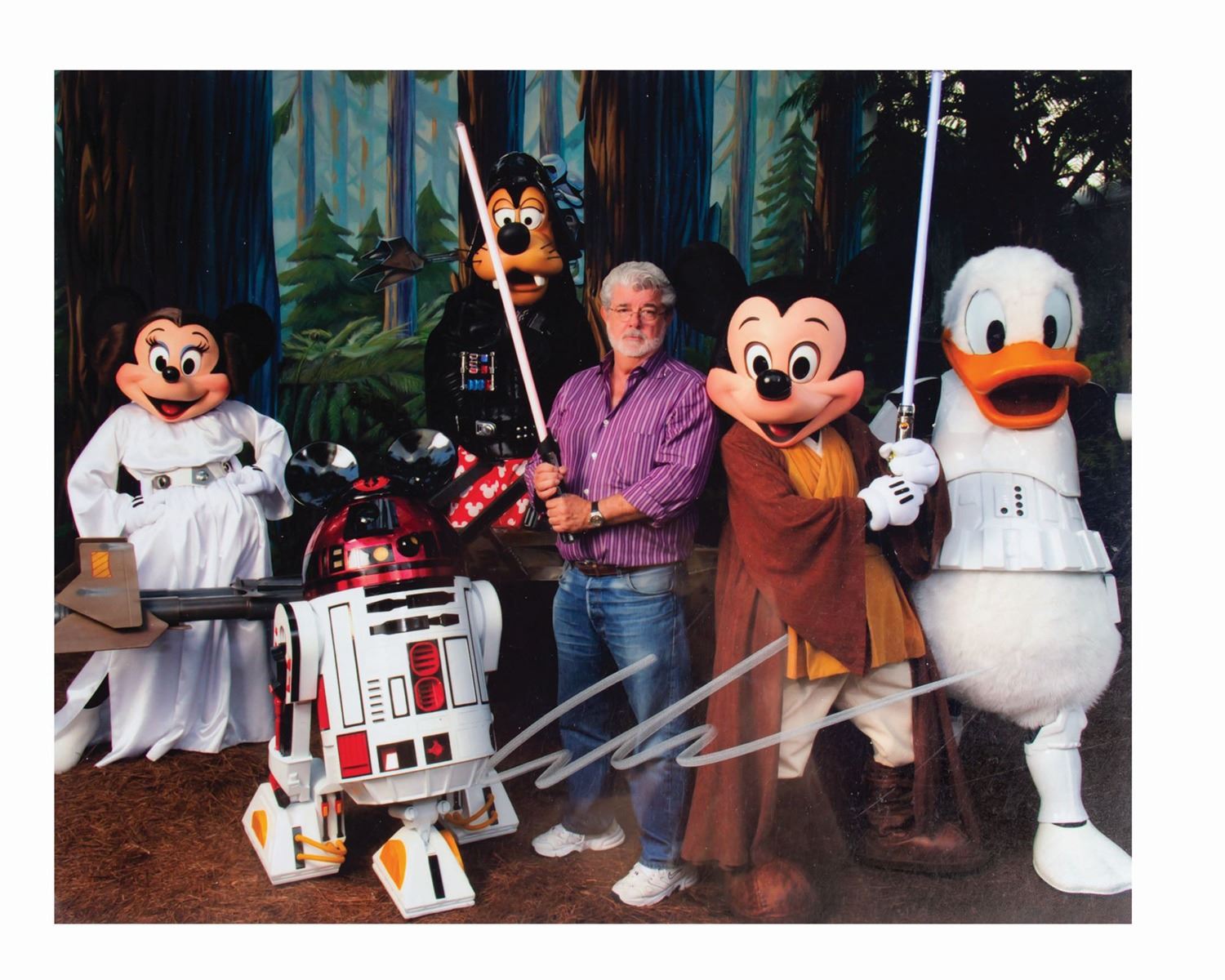 (Disney-MGM, 2010) A rare Star Tours photo signed by George Lucas. The photo was taken at Disney-MGM Studios and features Mickey, Minnie, Goofy, Donald Duck, a red R2-D2, and George Lucas. The photo is paired with a Star Tours button. The photo measures 8"x10" and the button measures 3" in diameter. The photo is in very good condition with minor wear and the button is in good condition with minor scratches on the reverse.