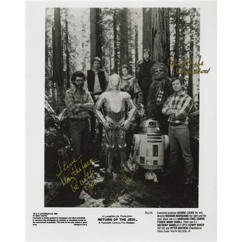 <B>George Lucas and Peter Mayhew Signed Photo.</B></I> This 8" x 10" b&w cast photo from "Return of the Jedi" is inscribed "Steve - May the force be with you" and signed by Lucas in gold ink, and is also signed by actor Peter Mayhew in gold ink. Lucas does not like to sign autographs and his signature is quite rare. In Excellent condition. <I>With COA from PSA/DNA.</B></I>
