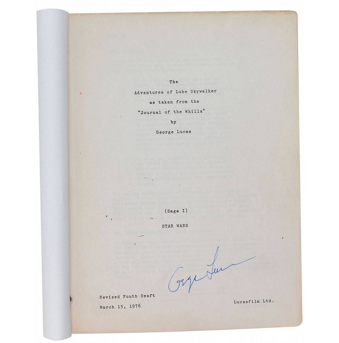 Original brad-bound revised fourth draft of the script for Star Wars, then entitled “The Adventures of Luke Skywalker as taken from the ‘Journal of the Whills’: Saga I: Star Wars,” March 15, 1976, 8.5 x 11, 156 pages, signed on the first page in blue felt tip by Lucas. In fine condition, with light overall toning. The consignor originally received the unsigned script as an award from his writing professor at USC, which he attended after serving in the Navy as a photographer. Lucas, an alumnus of USC’s film school, had taught a special course for Navy students while a graduate student in the late 1960s. When Lucas returned to the school to make a donation, the consignor ‘instructed’ him to sign the script, ‘from Navy man to Navy man.’