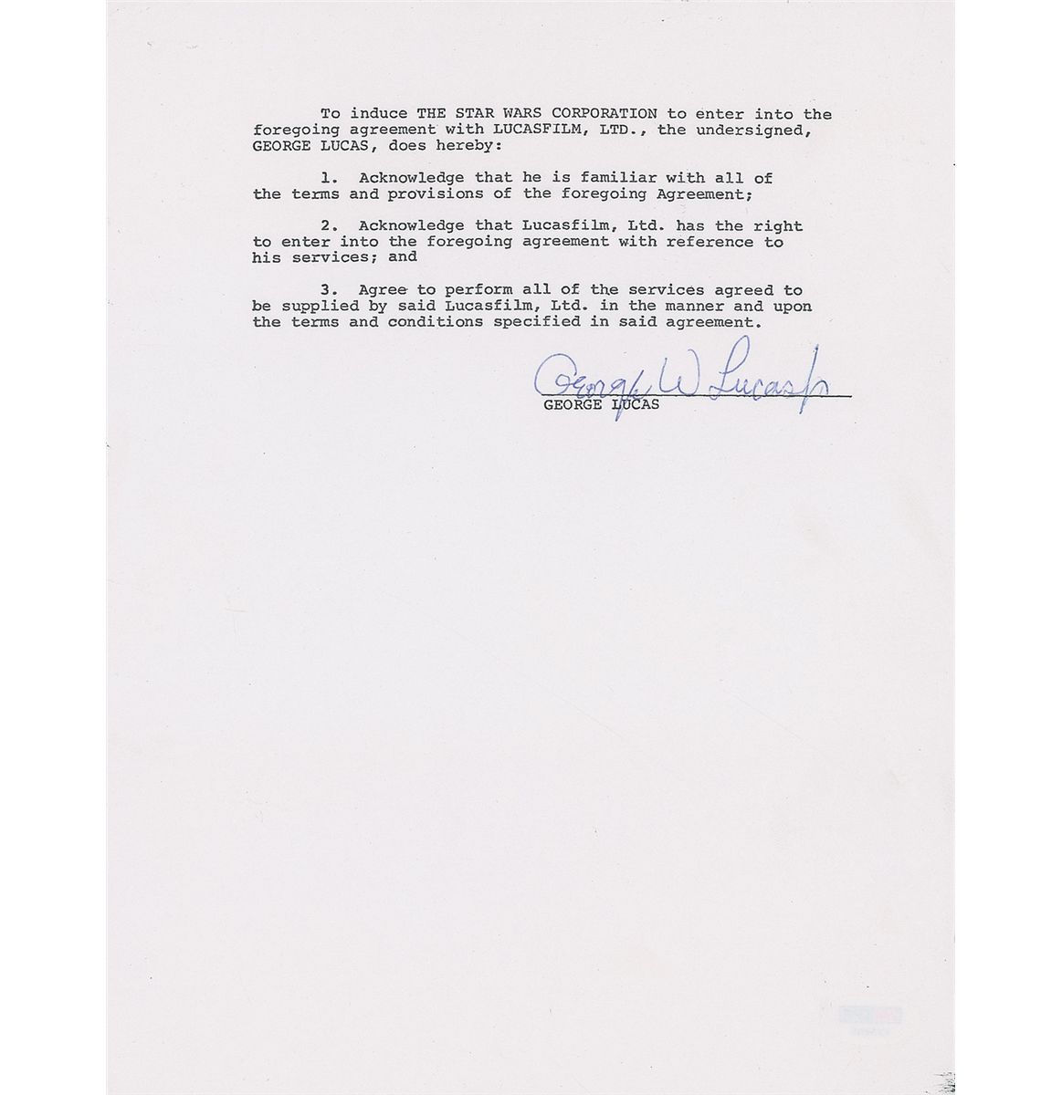 DS, signed “George W. Lucas, Jr.,” one page, 8.5 x 11, no date. Final page of a longer agreement begins: “To induce The Star Wars Corporation to enter into the foregoing agreement with Lucasfilm, Ltd., the undersigned, George Lucas, does hereby…Acknowledge that Lucasfilm, Ltd. has the right to enter into the foregoing agreement with reference to his services.” Signed at the conclusion by Lucas. In fine condition, with a staple hole to top left corner. Accompanied by a certificate of authenticity from PSA/DNA.