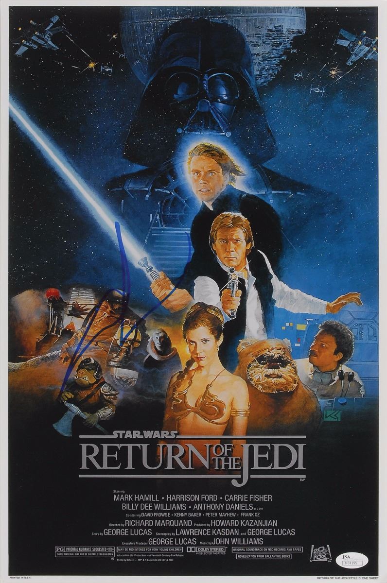 Desirable color satin-finish 12 x 18 photo of the poster for the 1983 film Star Wars: Episode VI—Return of the Jedi, signed in blue felt tip by Lucas. In fine condition, with a small crease near the top edge. Accompanied by a certificate of authenticity from JSA.