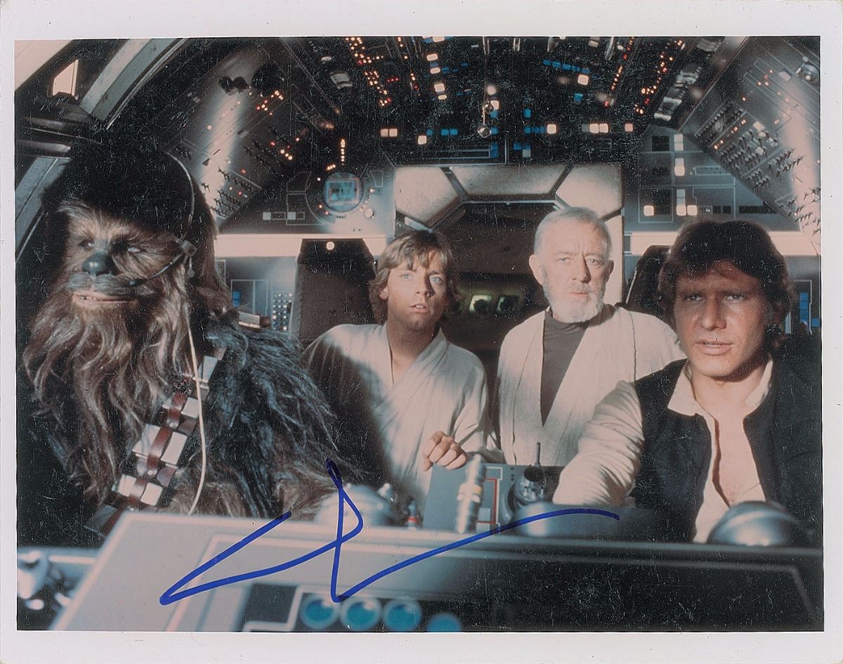 Color glossy 10 x 8 photo of Han Solo, Chewbacca, Luke Skywalker, and Obi-Wan Kenobi, signed in blue felt tip by Lucas. In very good to fine condition, with light overall surface scuffing.