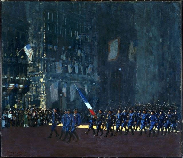 Artist: George Luks - Title: Blue Devils on Fifth Avenue - Medium: Fine Art Giclee on Canvas - Image Size: Approximately 17.25 inches x 20 inches - Framed: Unframed on Unstretched Canvas - Biography: Luks painted working-class subjects and scenes of urban life, the hallmarks of Ashcan realism, with great gusto. "Hester Street" (1905), in the collection of the Brooklyn Museum, captures Jewish immigrant life through Luks's vigorously painted representation of shoppers, pushcart peddlers, casual strollers, and curious onlookers of the ethnic variety that characterized turn-of-the century New York. Luks's work typifies the real-life scenes painted by the Ashcan School artists. Hester Street also demonstrates Luks' ability to effectively manipulate crowded compositions and to capture expressions and gestures as well as gritty background details. Allen Street (1905) and Houston Street (1917) are equally successful in this sense. The Lower East Side was a rich source of visual material for George Luks.
