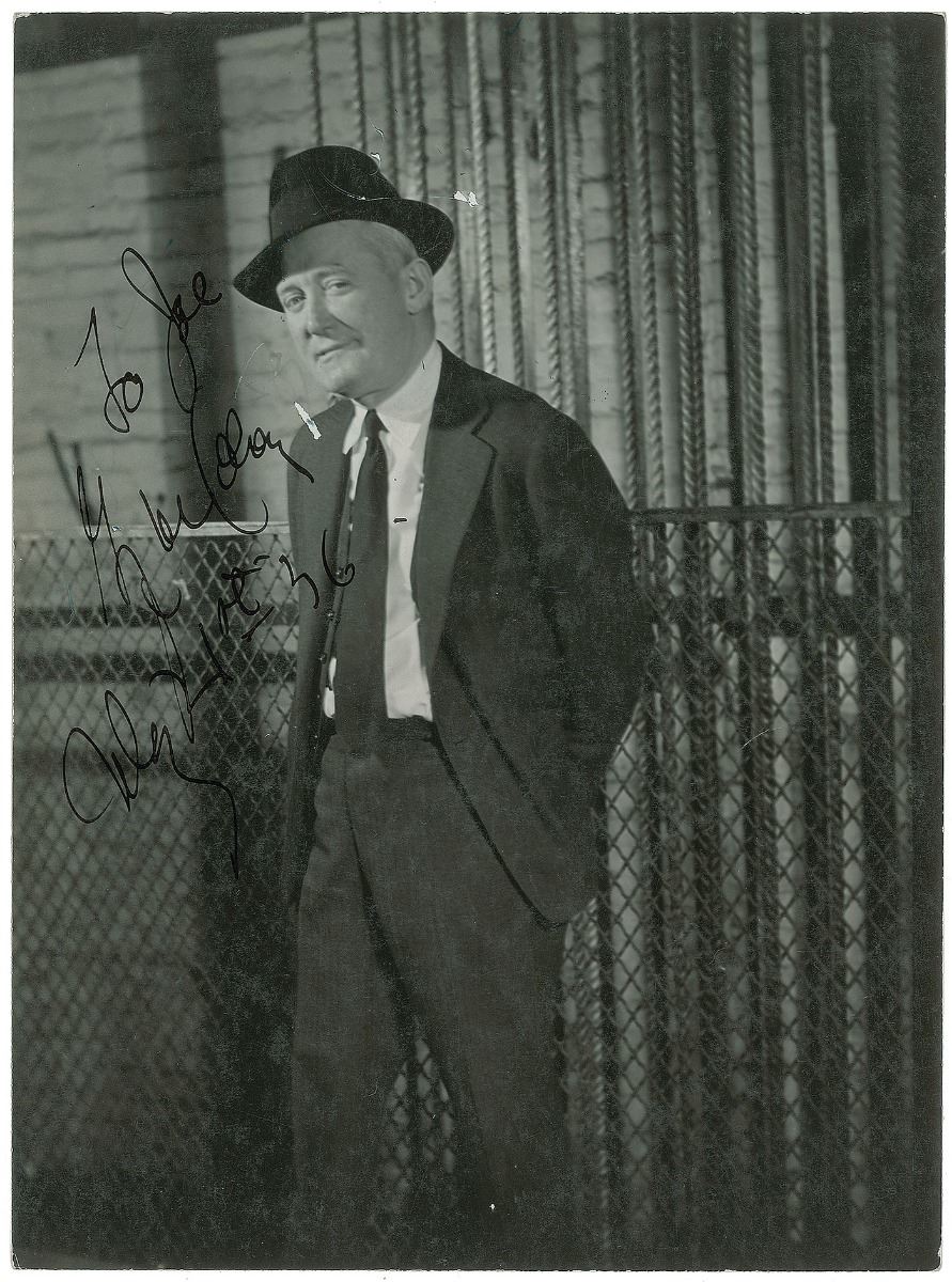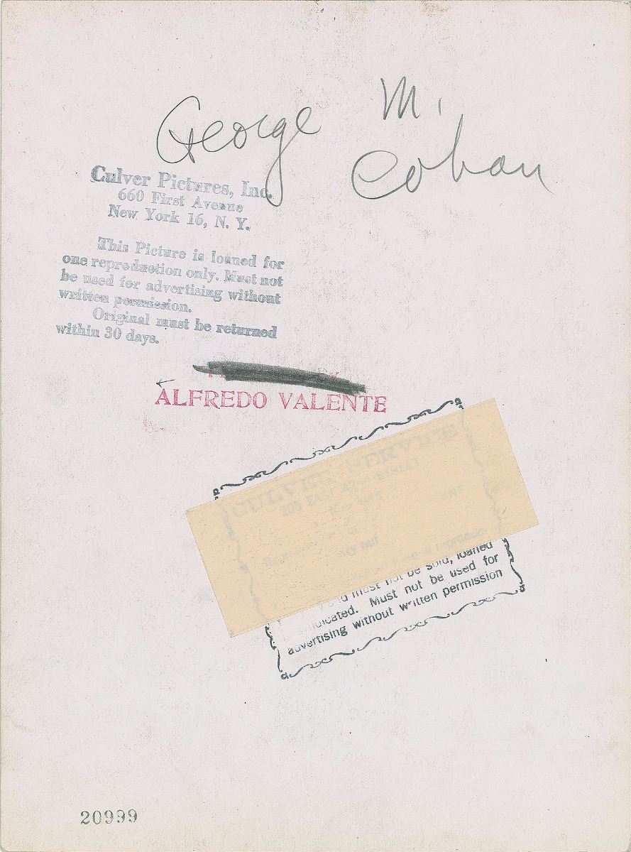 American playwright, songwriter, and actor (1878–1942), widely regarded as the father of American musical comedy, who takes a place among the most beloved entertainers of his era. Vintage semi-glossy 7 x 9.5 cardstock photo of Cohan posing backstage in a suit and tie, signed and inscribed in fountain pen, “To Joe, George M. Cohan, July 21st, ‘36.” Reverse bears Culver Pictures copyright stamps, as well as an Alfredo Valente photography stamp. In fine condition, with trimmed edges and some surface scratches.