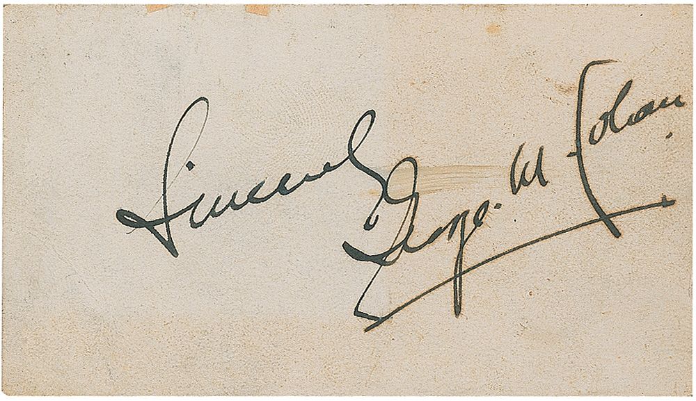 Vintage ink signature, “Sincerely, George M. Cohan,” on an off-white 3.5 x 2 card. In very good condition, with scattered toning and soiling, a couple brushes to signature, and mounting remnants on reverse.