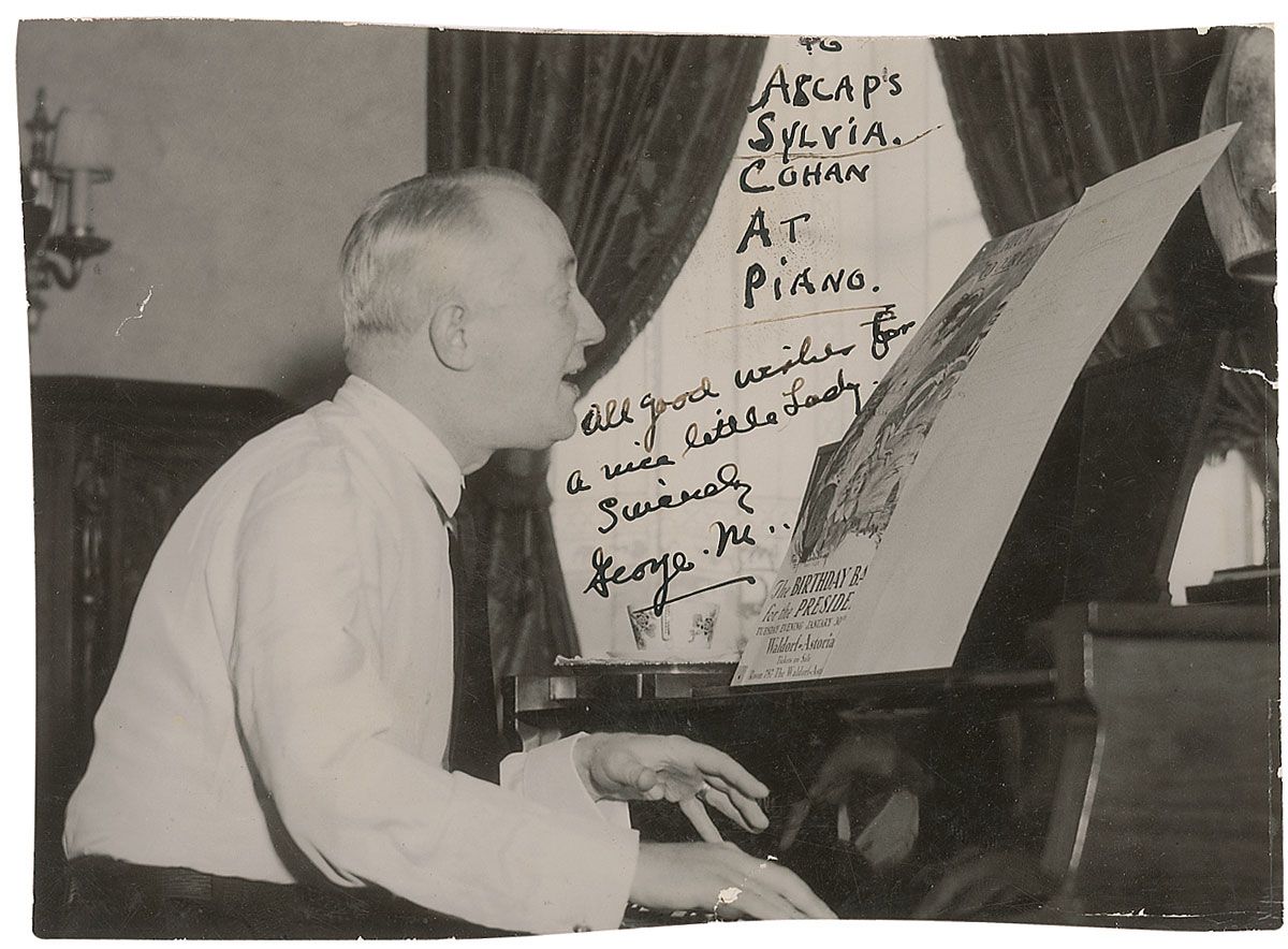 American playwright, songwriter, and actor (1878–1942), widely regarded as the father of American musical comedy, who takes a place among the most beloved entertainers of his era. Vintage glossy 6.75 x 4.75 photo of Cohan at a piano singing a song, signed and inscribed in fountain pen “To ASCAP’s Sylvia, All good wishes for a nice little lady, Sincerely, George M.,” adding “Cohan at piano,” in the middle of the inscription. Scattered creases and surface marks and trimmed edges, otherwise fine condition.