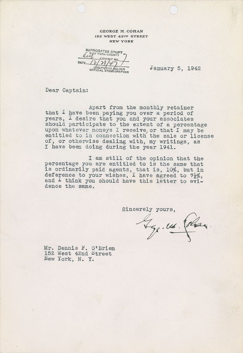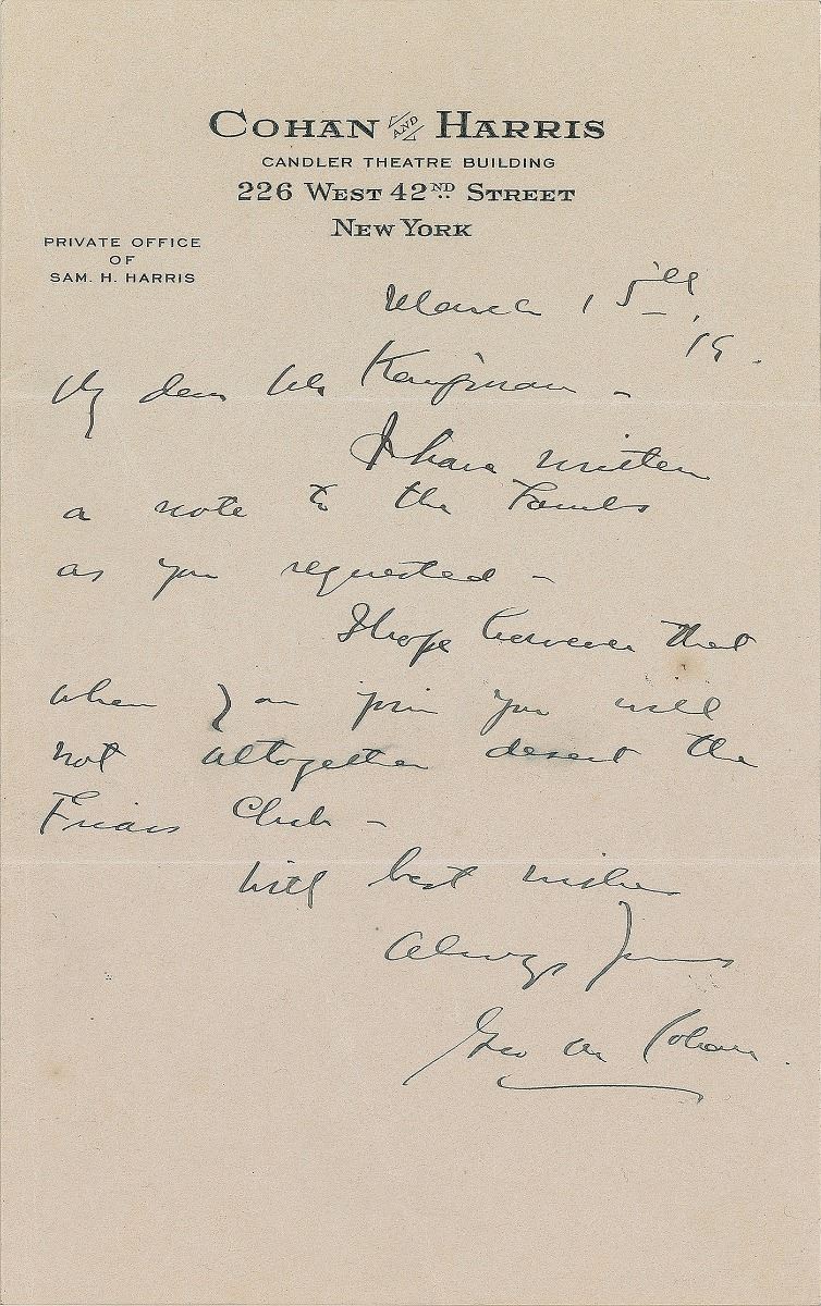 American playwright, songwriter, and actor (1878–1942), widely regarded as the father of American musical comedy, who takes a place among the most beloved entertainers of his era. Two letters: an ALS, signed “Geo. M. Cohan,” one page, 5 x 7.75, Cohan and Harris, March 15, 1919, in part: “I have written a note…as you requested—I hope however…you will not altogether desert the Friars Club”; and a TLS, signed “Geo. M. Cohan,” one page, 7.25 x 10.5, personal letterhead, January 5, 1942, in part: “I desire that you and your associates should participate to the extent of a percentage upon whatever moneys I receive, or that I may be entitled to in connection with the sale or license of, or otherwise dealing with, my writings, as I have been doing during the year 1941.” In overall fine condition.